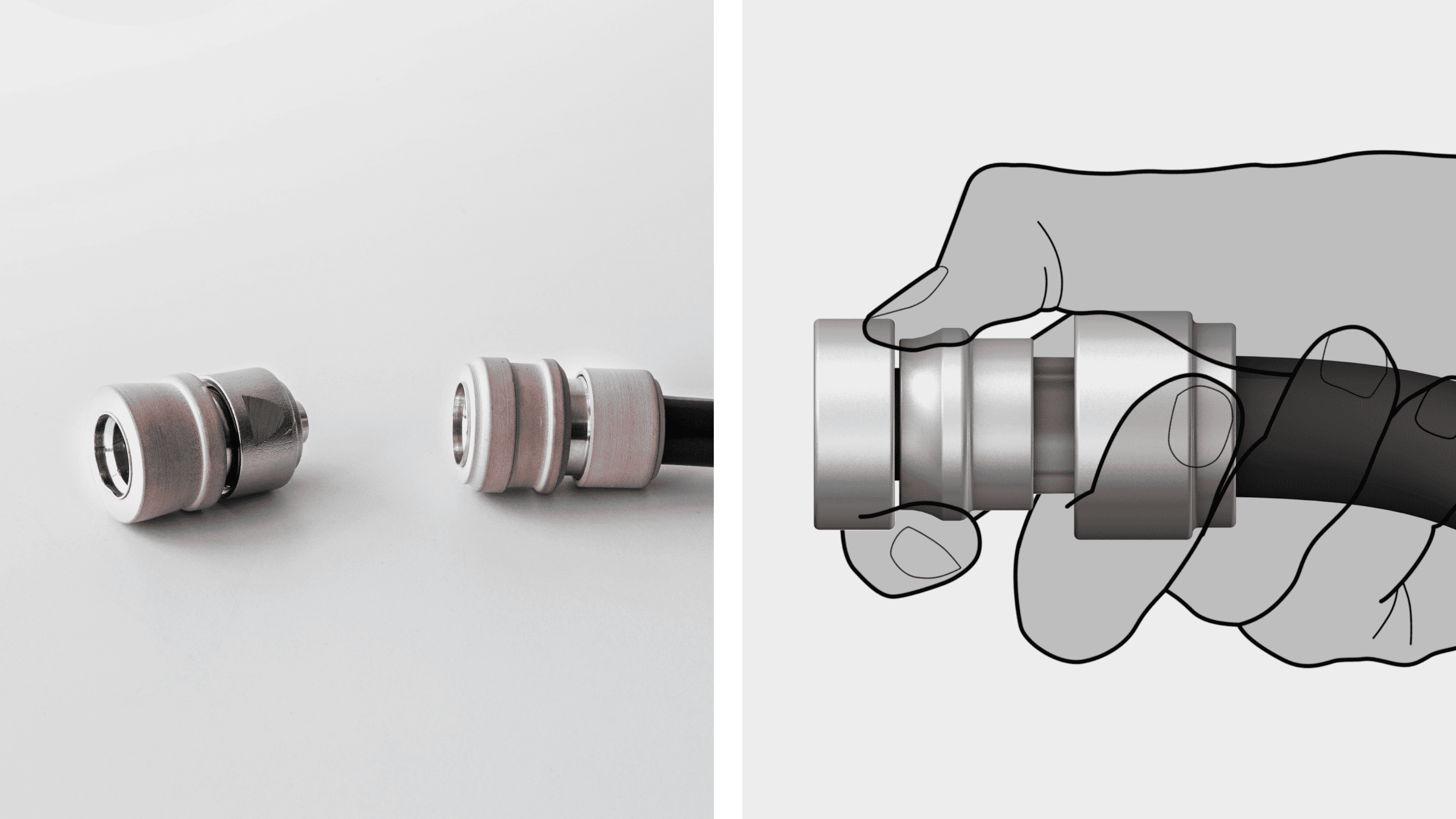 Design der GEKA Plus Kupplung mit und ohne dem Feature Wasserstop. Verbesserung der Ergonomie und Integration der von formteam entwickelten Marken-DNA.